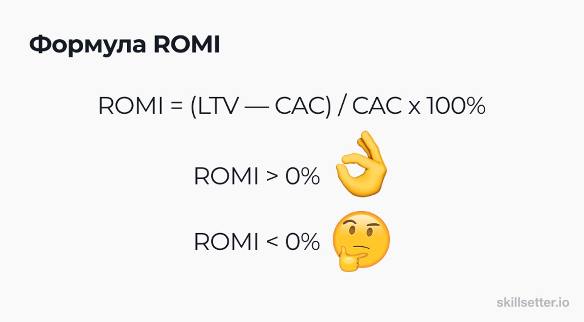 Базовая формула ROMI: ROMI = (LTV — CAC) / CAC x 100%